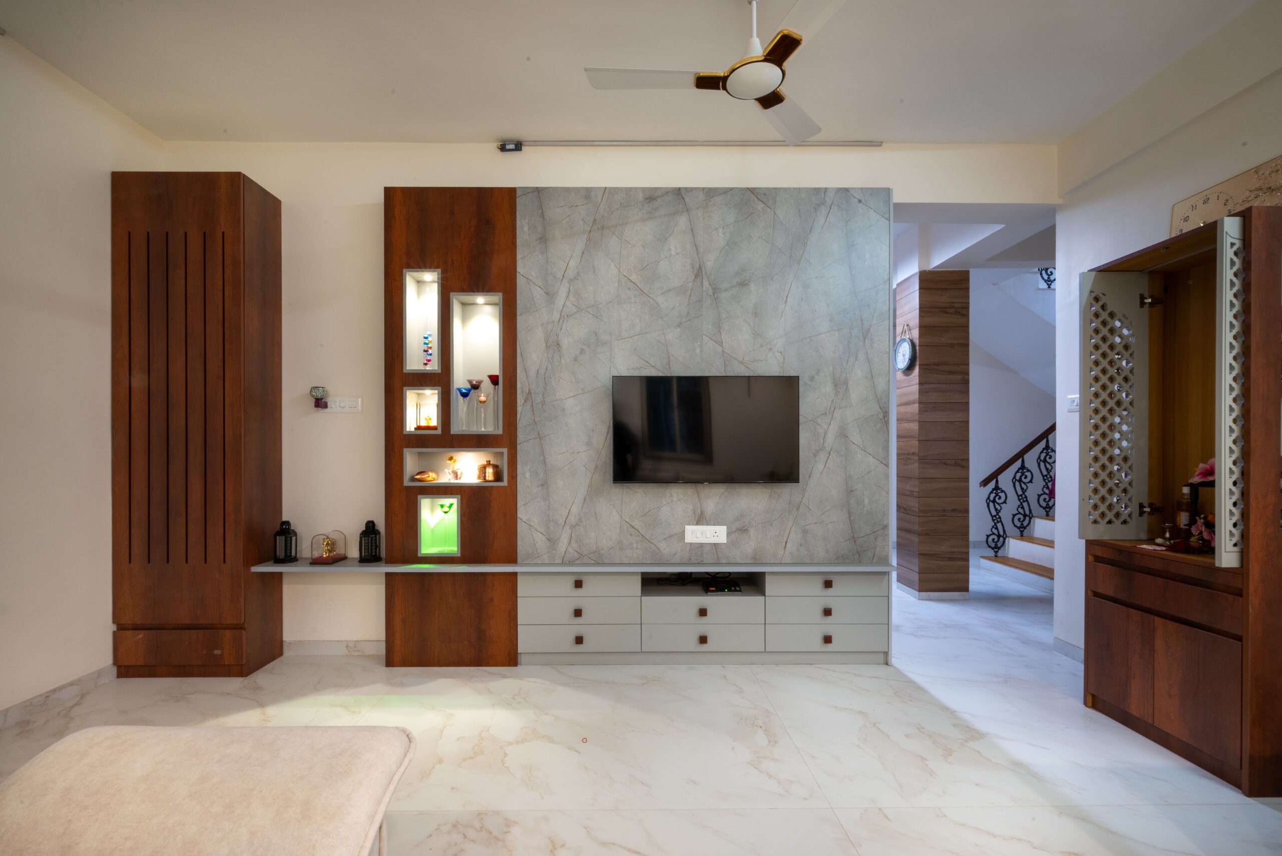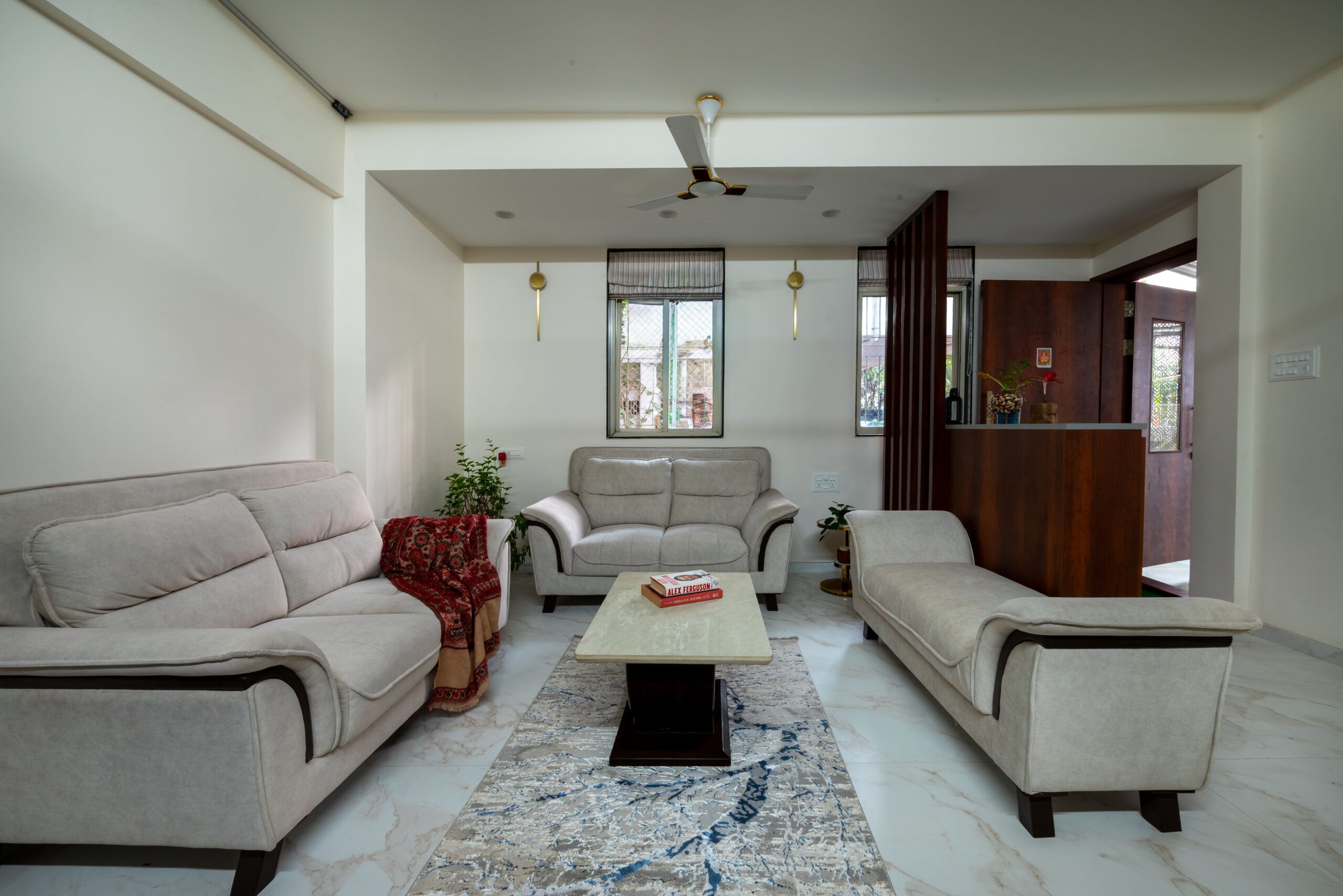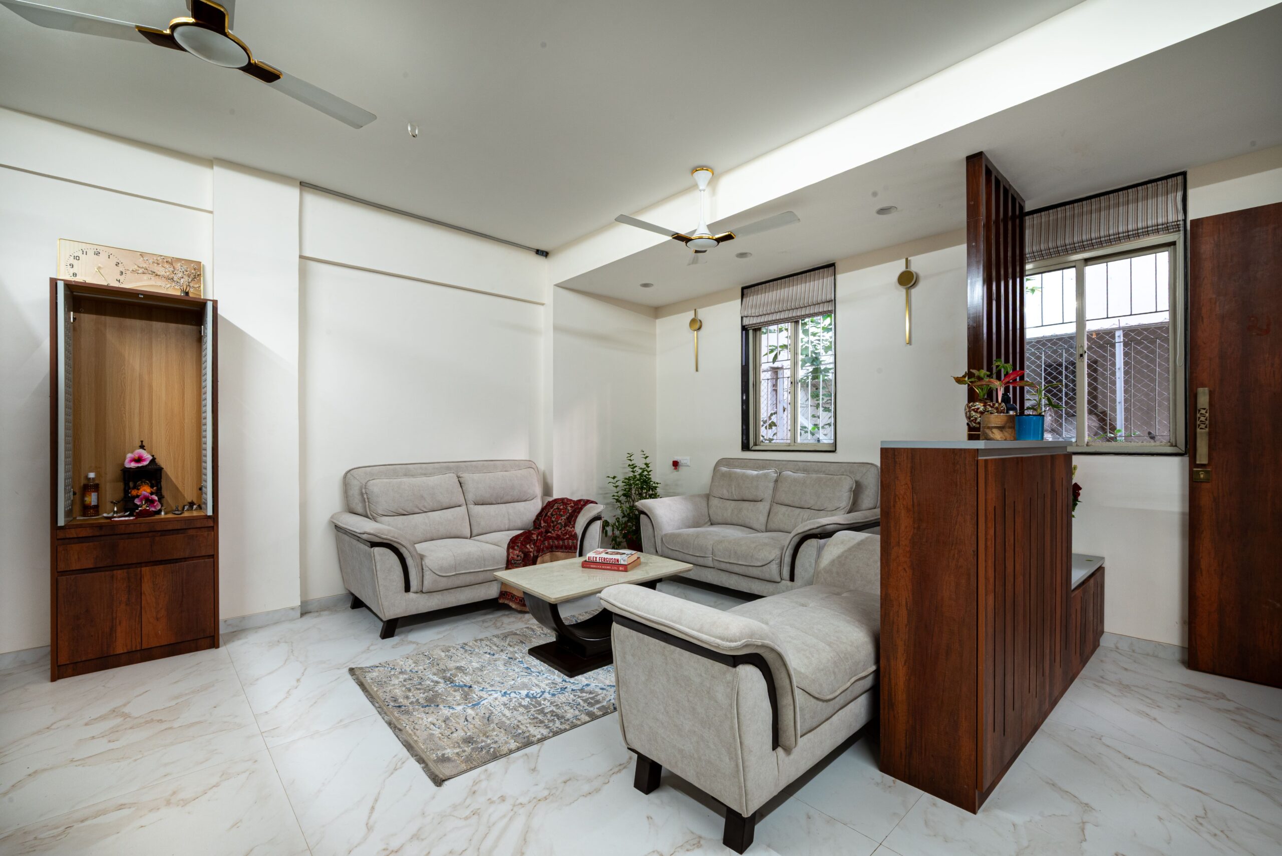 The interior renovation for Mr. Adwait Govitrikar showcases a refined contemporary design defined by a warm wood-and-beige material palette, marble-finish vitrified flooring, and custom elevations. In the living area, a textured feature wall with illuminated display niches and a streamlined TV console creates a striking focal point. A serene, contemporary bedroom designed in soft neutral tones, featuring a custom platform bed with upholstered detailing and layered textures for added warmth. Subtle design elements like the fabric-panel backdrop, floating dresser with arched mirror, and patterned curtains enhance both functionality and visual appeal. The kitchen features a sleek U-shaped layout with black granite countertops, fluted glass shutters, and integrated LED lighting for both functionality and ambience.