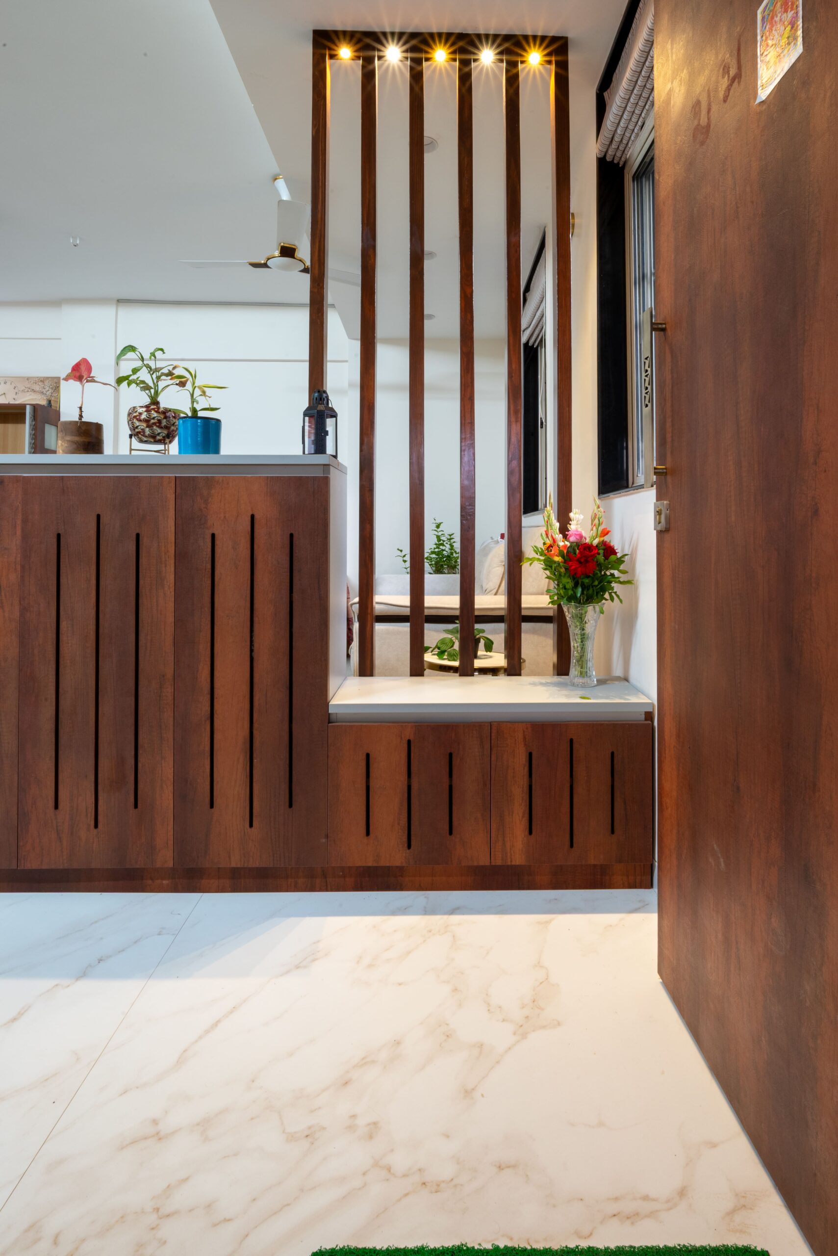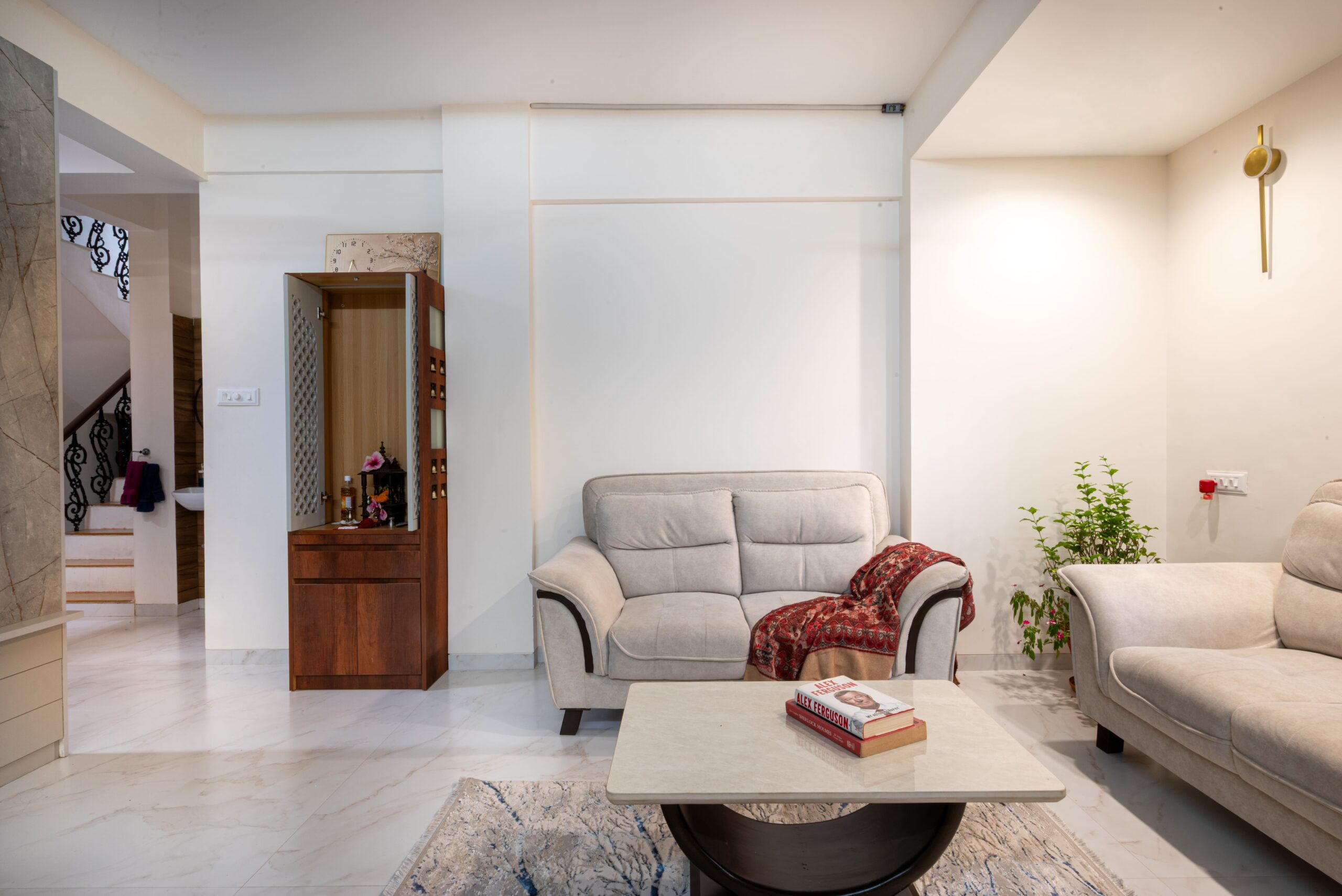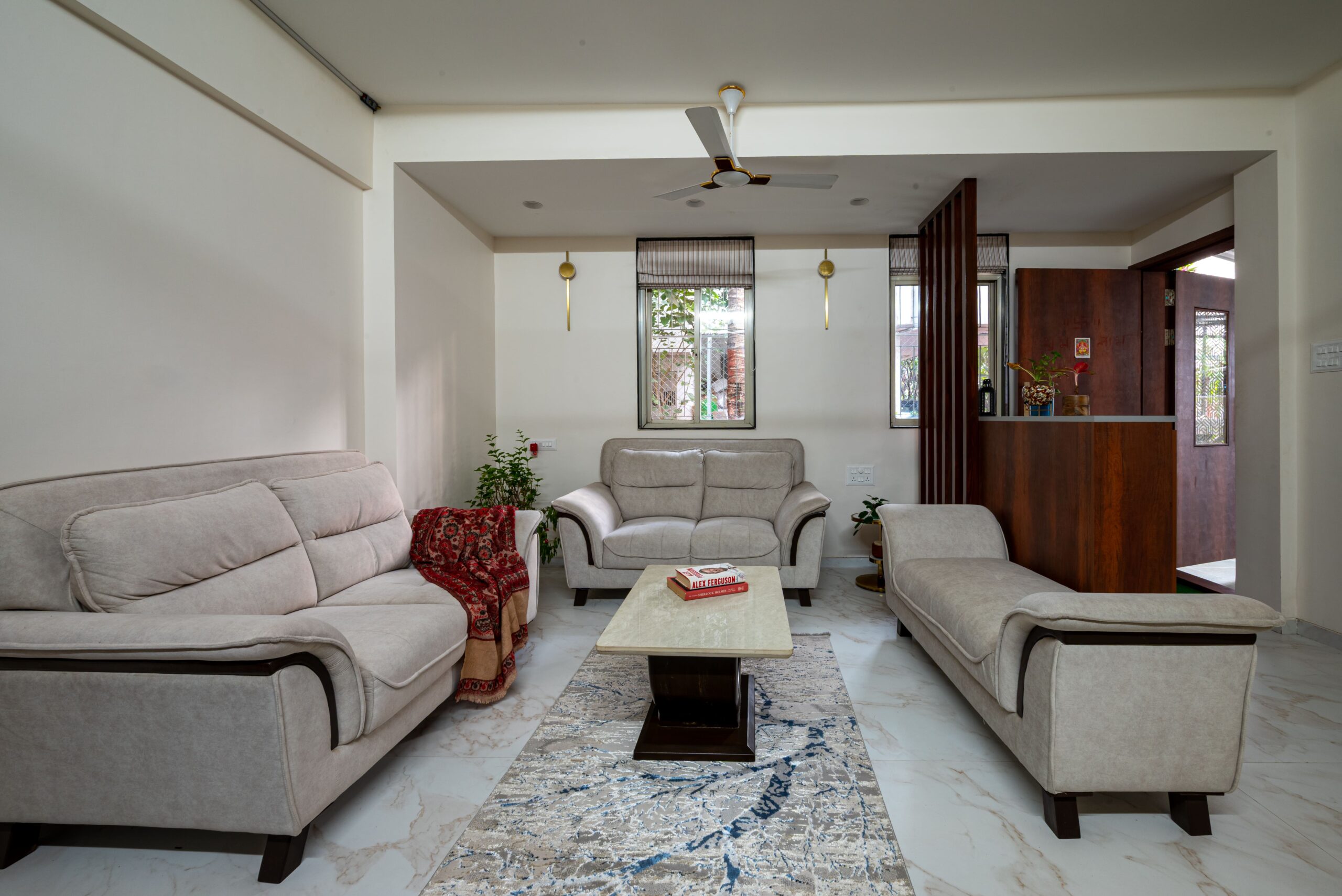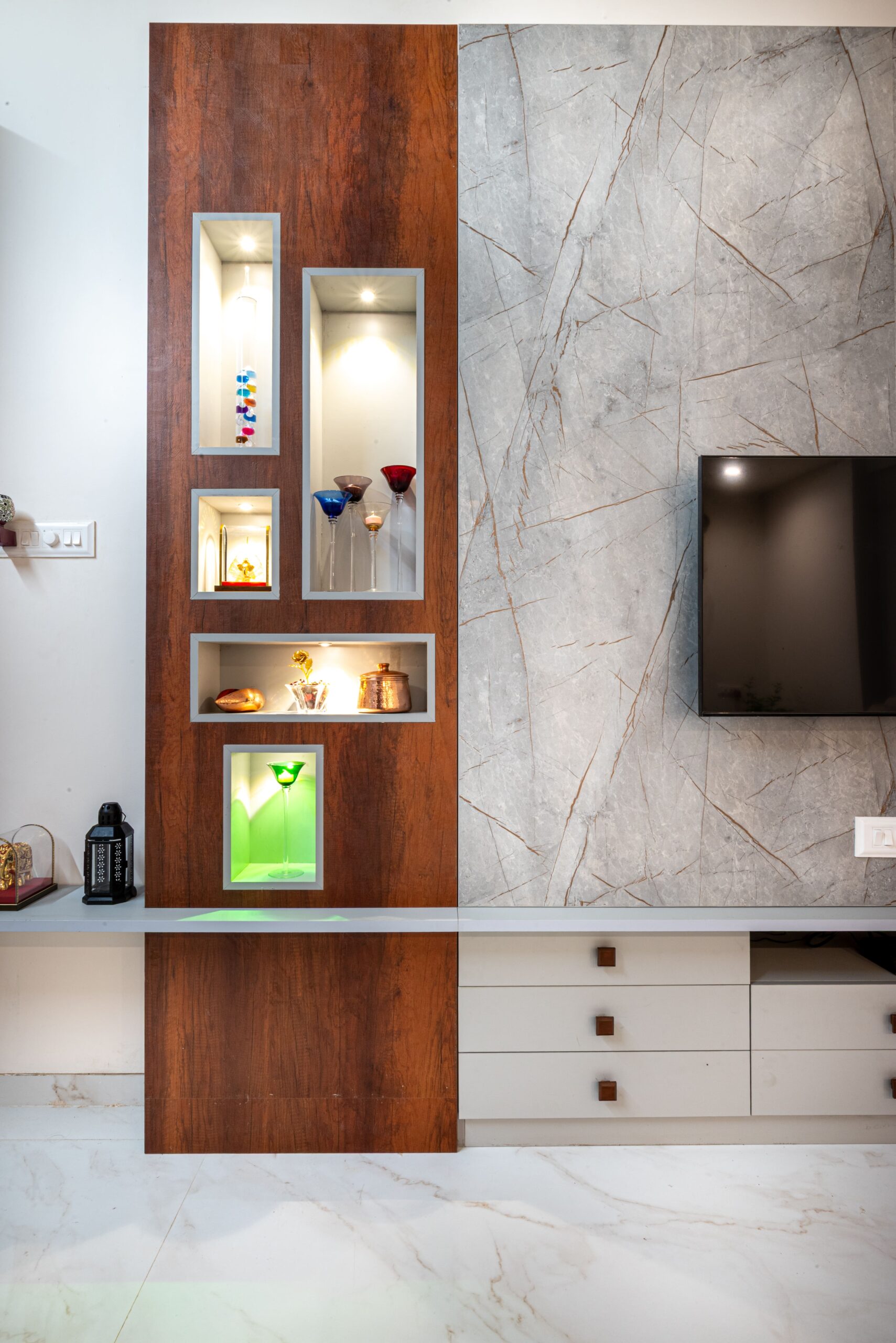 The interior renovation for Mr. Adwait Govitrikar showcases a refined contemporary design defined by a warm wood-and-beige material palette, marble-finish vitrified flooring, and custom elevations. In the living area, a textured feature wall with illuminated display niches and a streamlined TV console creates a striking focal point. A serene, contemporary bedroom designed in soft neutral tones, featuring a custom platform bed with upholstered detailing and layered textures for added warmth. Subtle design elements like the fabric-panel backdrop, floating dresser with arched mirror, and patterned curtains enhance both functionality and visual appeal. The kitchen features a sleek U-shaped layout with black granite countertops, fluted glass shutters, and integrated LED lighting for both functionality and ambience.